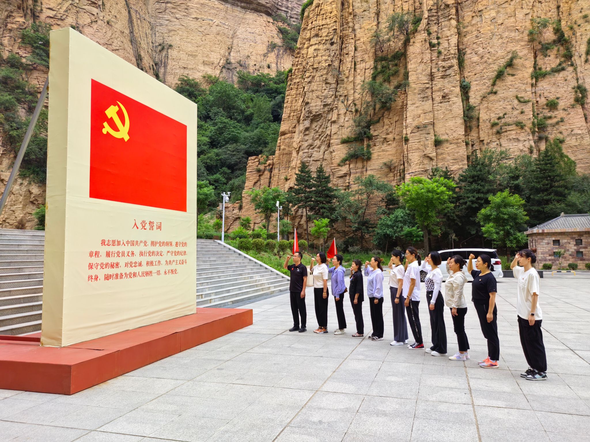 6月17日上午,全体成员赴黎城县黄崖洞革命纪念地进行参观。黄崖洞革命纪念地是全国爱国主义教育示范基地,这里曾是抗日战争时期华北敌后最大的兵工基地,被誉为“人民军工摇篮”,也是“没有围墙的抗战博物馆”,是“黄崖洞精神”的诞生地,是“太行精神”的重要组成部分,是左权等老一辈无产阶级革命家工作、战斗过的地方。党员们首先在太行门广场的誓词墙前,由党委书记李群生领誓,庄严而郑重地重温入党誓词。党员们随后沿着台阶攀登太行山,行走在崇山峻岭中的运输栈道上,历经3小时登上黄崖洞革命圣地,切身感受了八路军在抗战时期的奉献精神和艰苦过往,参观了黄崖洞烈士陵园、展览馆及兵工厂旧址群,各种珍贵文物、历史图片等资料,重温了八路军战士克服重重困难、于悬崖绝壁间奠基创业的革命精神。