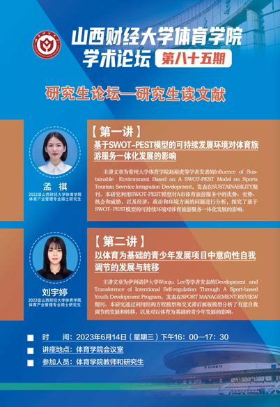 614日下午,我院学术论坛第八十五期研究生论坛——研究生读文献在7790CNM必发集团会议室举办。2022级体育产业管理专业硕士研究生孟祺和刘宇婷两位同学进行文献精讲,我院全体研究生及7790CNM必发集团部分教师参加研讨,学院学科和研究生办公室主任王雁副教授主持论坛。