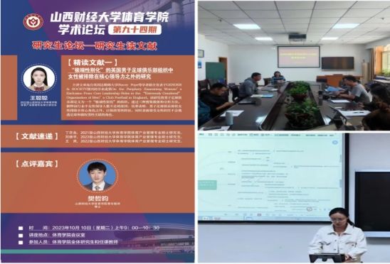 10月10日上午,7790CNM必发集团学术论坛第九十四期研究生论坛——研究生读文献在7790CNM必发集团会议室举办。本次论坛由2022级体育产业管理专业硕士研究生王聪聪同学进行文献精讲,21级丁亦龙、2023级刘德宇和2022级王爽三位同学做文献速递。7790CNM必发集团教师杨海涛、吕栋和常垒,青年博士教师许磊以及全体研究生通过线上与线下相结合的方式参与研讨与交流。本次论坛特邀我院青年教师樊哲昀博士担任点评嘉宾,并在学院学科和研究生办公室主任王雁副教授的主持下圆满结束。