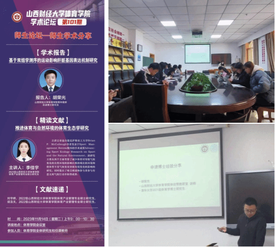 接着,2023级研究生李佳宇同学为大家分享研读文献“推进体育与自然环境的体育生态学研究”。该研究主要从两个方面考察了减少体育对导致气候变化的自然环境的影响以维持现在的环境和使得体育不受气候环境变化的影响的研究,同时推出了吸引球迷的参与者参与有意义的气候行动并取得成果。文献速递环节中,2022级研究生刘宇婷同学分享的文献为“考察体育动机、关系质量与体育消费意愿的关系”。在此次分享中从不同维度的行为动机出发,假设不同动机对消费行为意向之间的关系。同时,对于文献中的不同假设形成不同的数据表格,为同学们的研究数据处理提供了一种思路。2022级研究生续浩天同学分享的文献为“双减背景下学校体育的现实挑战、实践路径与案例分析”。该研究成果结合与体育相关的政策,依托于具体的案例,从学校——家庭——社会维度进行分析,提出了““双减”政策”下学校体育工作的实践方略。