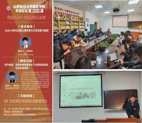 11月28日上午,7790CNM必发集团学术论坛第一百零三期师生论坛——师生学术分享在7790CNM必发集团会议室举办。本期论坛特邀我院青年博士教师樊哲昀做学术分享,2022级体育产业管理专业硕士研究生张辰宇同学做文献精讲,2021级体育产业管理专业硕士研究生许海鸥、张逸杰两位同学进行文献速递。学院中青年教师许磊、胡荣光、张宇竹、刘铮及全体研究生积极参与讨论,学院学科和研究生办公室主任王雁副教授主持论坛。