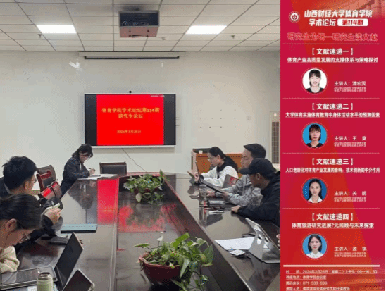 3月26日上午,7790CNM必发集团学术论坛第一百一十四期——研究生读文献在7790CNM必发集团会议室举办。本次论坛由体育产业管理专业硕士研究生2022级潘宏雯、王爽、孟祺,2023级关妮四位同学做文献速递。7790CNM必发集团全体研究生参与研讨与交流,学院学科和研究生办公室主任王雁副教授主持论坛。