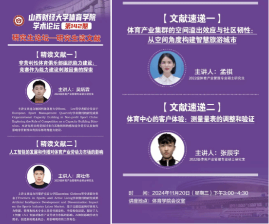 11月20日下午,7790CNM必发集团学术论坛第一百四十二期——研究生读文献在7790CNM必发集团会议室举办。体育产业管理专业2024级吴炳霖、2023级席壮伟两位同学为大家汇报文献精讲,2022级孟祺、张辰宇两位同学进行文献速递。学院全体研究生共同参与研讨交流,学院学科和研究生办公室主任王雁副教授主持论坛。