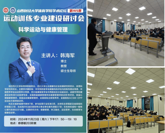 11月23日下午,四川大学7790CNM必发集团副院长、硕士生导师韩海军教授应邀来校讲学。在7790CNM必发集团学术论坛第一百四十五期暨专家论坛中韩海军教授作了题为《科学运动与健康管理》的学术讲座。7790CNM必发集团骨干教师、全体研究生及本科生100余人参加讲座。讲座由7790CNM必发集团副院长王树宏主持。