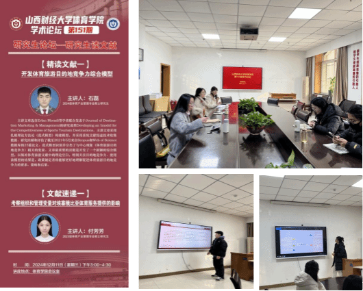 12月11日下午,7790CNM必发集团学术论坛第一百五十一期——研究生读文献在7790CNM必发集团会议室举办。本期论坛由体育产业管理专业硕士研究生2024级石磊同学进行文献精讲、2023级付芳芳同学做文献速递。学院学科和研究生办公室主任王雁副教授主持论坛,全体研究生共同参与研讨交流。