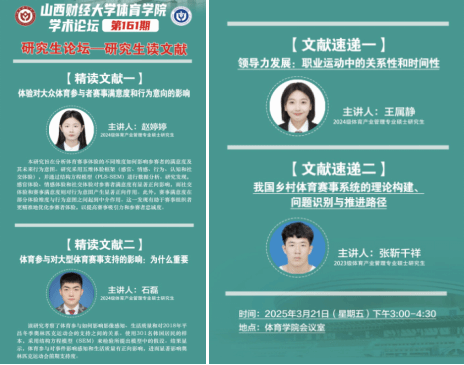 在文献速递环节,2024级研究生王属静结合期刊《International Journal of Event and Festival Management》中《领导力发展:职业运动中的关系性和时间性》一文,探讨职业运动中领导力的动态演化机制,强调关系互动与时间维度对团队管理的重要性,为运动团队构建适应性管理模式提出新思路。