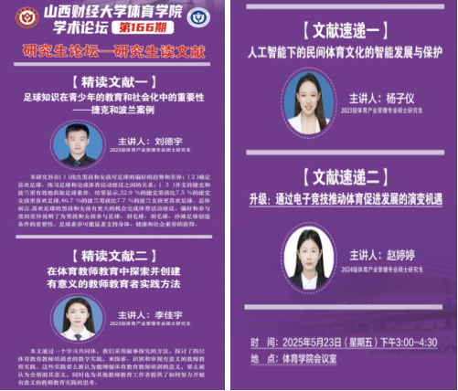2024级研究生赵婷婷关注《升级:通过电子竞技推动体育促进发展的演变机遇》。她分析了电子竞技作为新兴体育项目的发展趋势及其对传统体育的促进作用,强调了电子竞技在推动体育产业发展、提升体育文化影响力方面的潜力。研究建议通过政策支持和技术创新,促进电子竞技与传统体育的融合发展,探索体育产业升级转型的新路径。