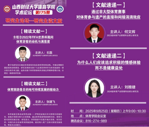 9月25日上午,7790CNM必发集团第175期学术论坛暨研究生读文献活动在学院会议室成功举办。本次活动以“体育赛事与旅游的多重效应及可持续路径探析”为主题,聚焦大型与非大型体育赛事对旅游与参与遗产的影响,探讨体育旅游在可持续发展中的价值,并关注人们在体育活动中对情感体验与健康益处的追求。活动由学院学科与研究生办公室主任王雁副教授主持,全体研究生共同参与,现场学术氛围浓厚、思维碰撞频频。