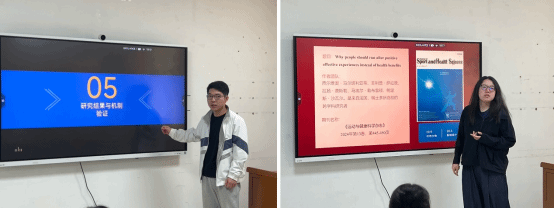 在文献速递环节,2023级研究生何文辉分享了《通过非大型体育赛事对体育参与遗产的直接和间接涓滴效应》研究成果,指出非大型赛事在促进青少年体育与社区体育中的积极作用,提出了加强基层体育设施和激励机制的政策建议。2024级研究生刘雅婕则以《为什么人们应该追求积极的情感体验而不是健康益处》为切入点,强调体育活动应注重积极情感体验的塑造,认为这是激发大众参与热情、提升运动黏性的关键因素。