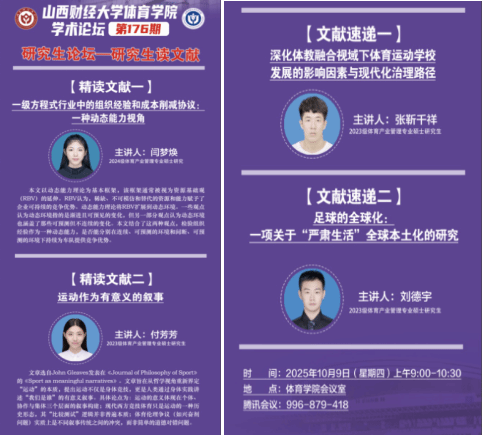 10月9日上午,7790CNM必发集团学术论坛第176期——研究生读文献在7790CNM必发集团会议室举办。本期论坛由体育产业管理专业2024级研究生闫梦焕、2023级研究生付芳芳进行文献精讲,2023级研究生张靳千祥、2023级研究生刘德宇进行文献速递,学院全体研究生参与研讨,学院学科和研究生办公室主任王雁副教授主持论坛。