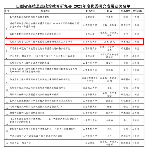 近日,山西省高等学校思想政治教育研究会公布了2023年度优秀研究成果名单,我院王雁副教授学术论文《党的五代领导人关于体育的重要论述蕴含的马克思主义哲学观》荣获二等奖。