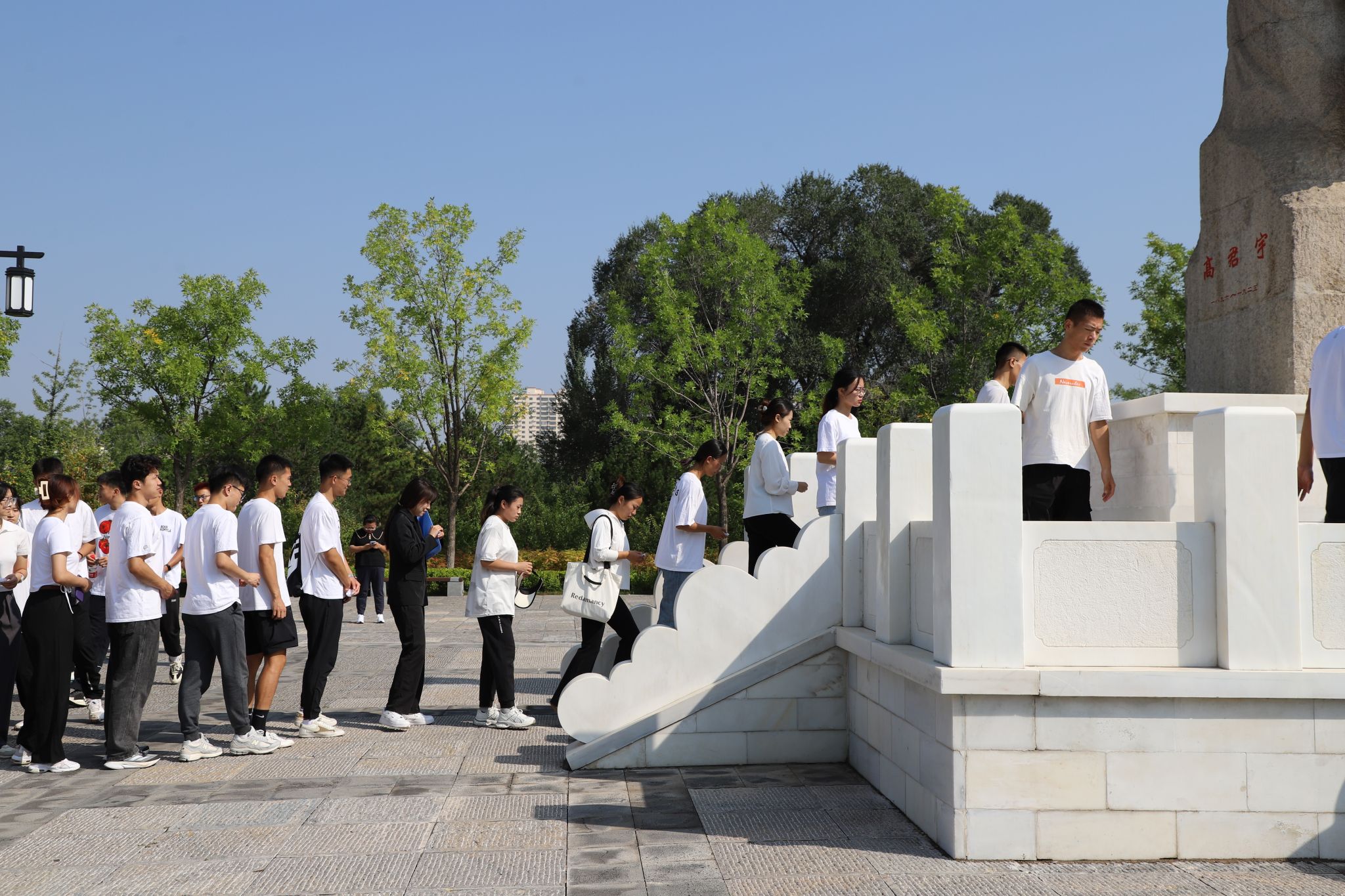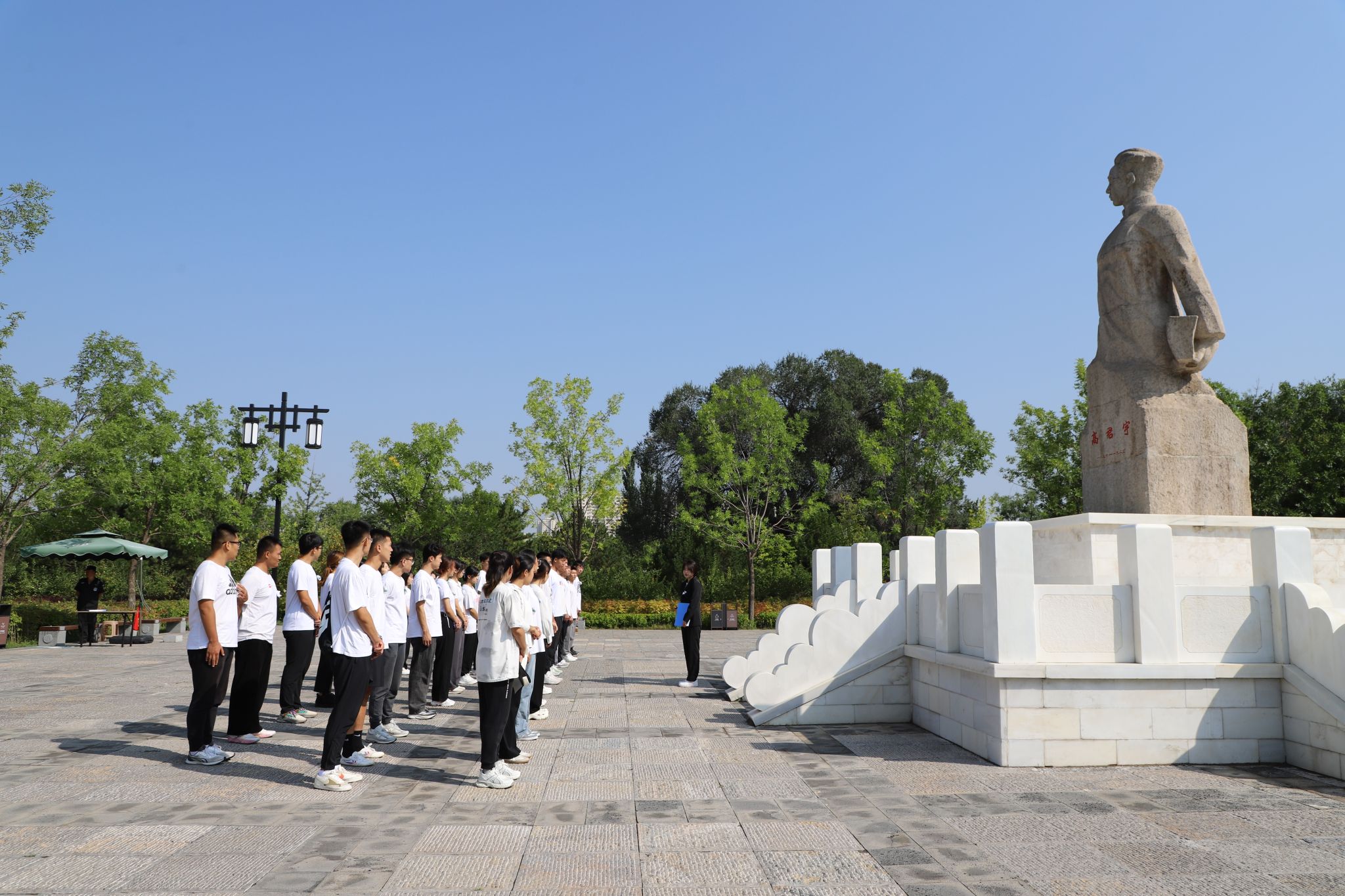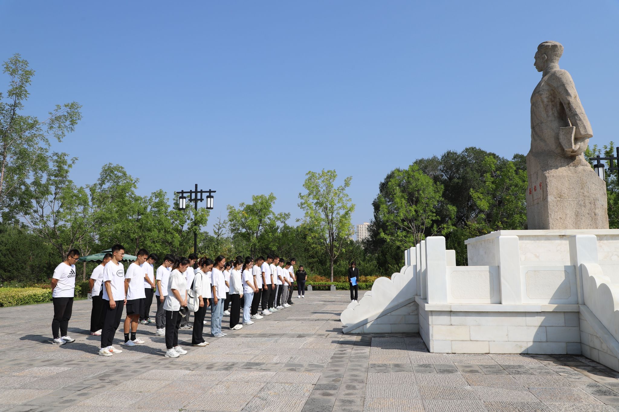缅怀英烈,是为了不要忘却;致敬追思,是为了砥砺前行。高君宇烈士雕像在青松的掩映下面庞更显坚毅,活动伊始,师生们列队整齐,表情庄重,在高君宇烈士雕像前共同默哀一分钟,深切缅怀革命先烈。默哀毕后,师生们手捧白花,怀着无比崇敬的心情在塑像前鞠躬,献花。献花后,师生们庄严肃立,齐声高唱中华人民共和国国歌,在雄壮的国歌歌声中,缅怀英雄烈士,致敬英雄,铭记历史。最后,全体师生怀着崇敬的心情认真参观了烈士陵园,师生们依次瞻仰烈士纪念墙,认真敬读每一句文字,用心感悟每一个场景,深深体会着烈士当年浴血奋战的革命精神和奉献精神。