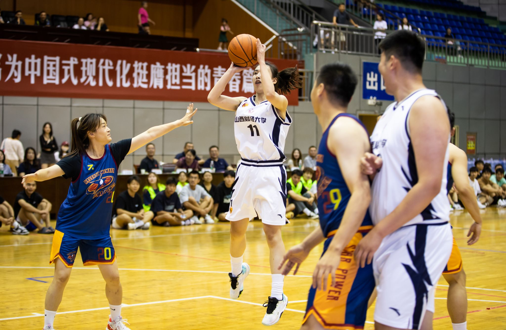 随后,山财男女篮与星动力篮球队进行了一场激烈而友好的篮球比赛,这是他们最后一次代表财大出战,此地一为别,孤蓬万里征……