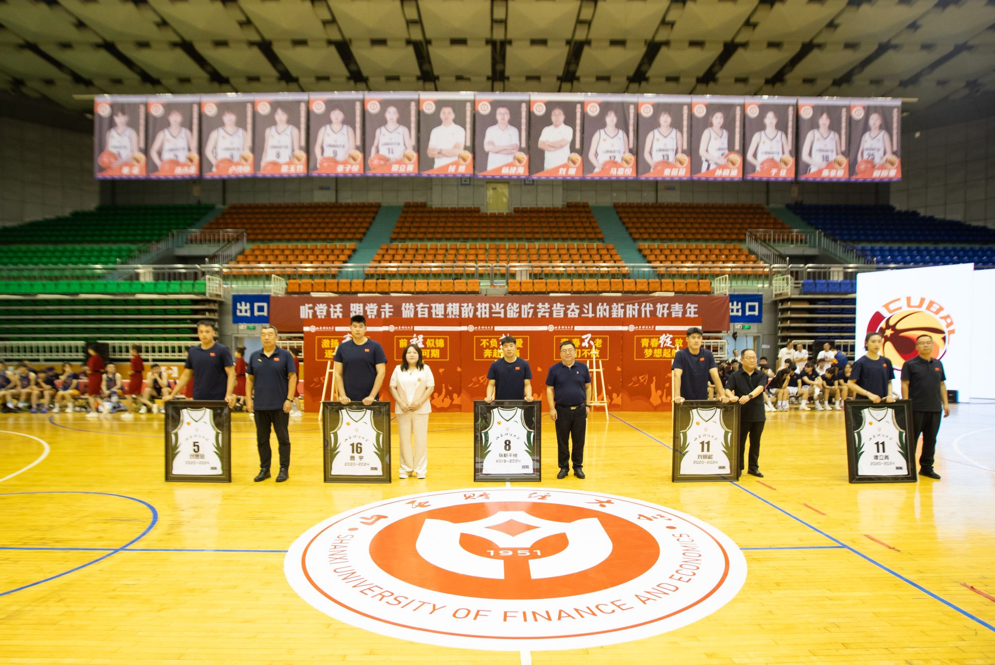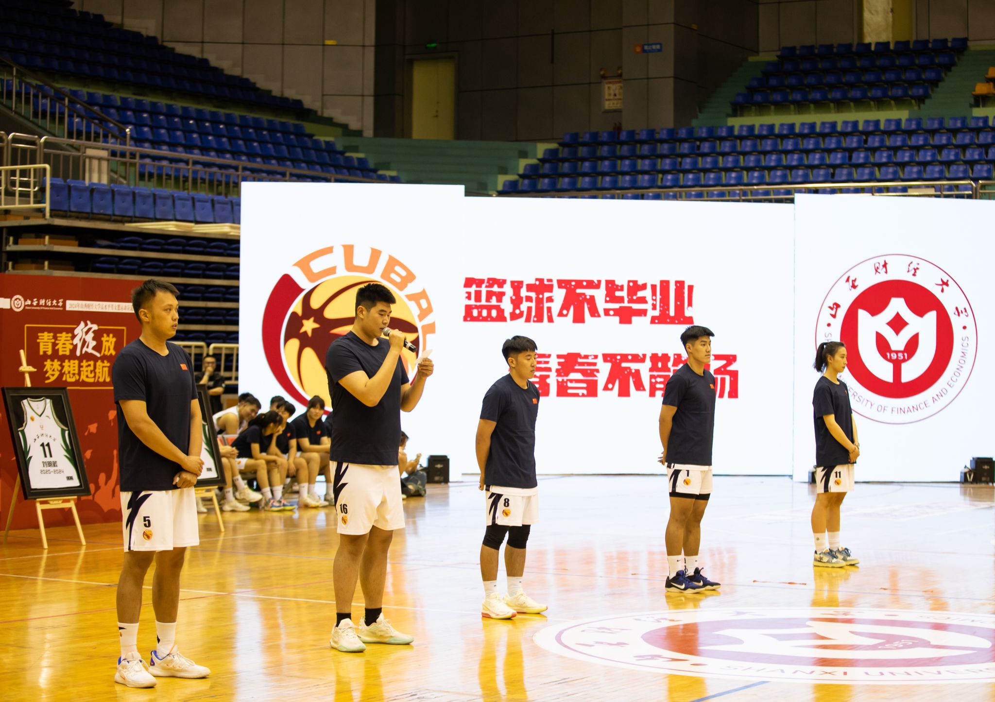在退役环节,退役球员深情表达了对母校的无限眷恋,对教练和队友的依依不舍,并祝愿球队在CUBAL的赛场上取得更高的成就,祝福母校的明天越来越好。现役球员表达了对师哥师姐的无比崇敬,他们立志将把山财篮球精神一代代传承下去,无惧无畏,不断前行,为梦想拼搏,为财大争光。男女篮主教练谷晨旭和付然分别讲述了男女篮的光辉历史,回顾了退役球员在校的一点一滴,他们见证了队员们的成长与荣耀,鼓励队员们将篮球精神转化为事业发展的强大动力,张开双臂迎接崭新的生活。张靳千祥高中教练的神秘登场,让这个叱咤赛场的男篮队长瞬间泪崩,谭立菁父亲在新疆的遥远祝福,触动了这名篮球女将最柔软的心灵,让她更加自信勇敢地面对美好的未来。