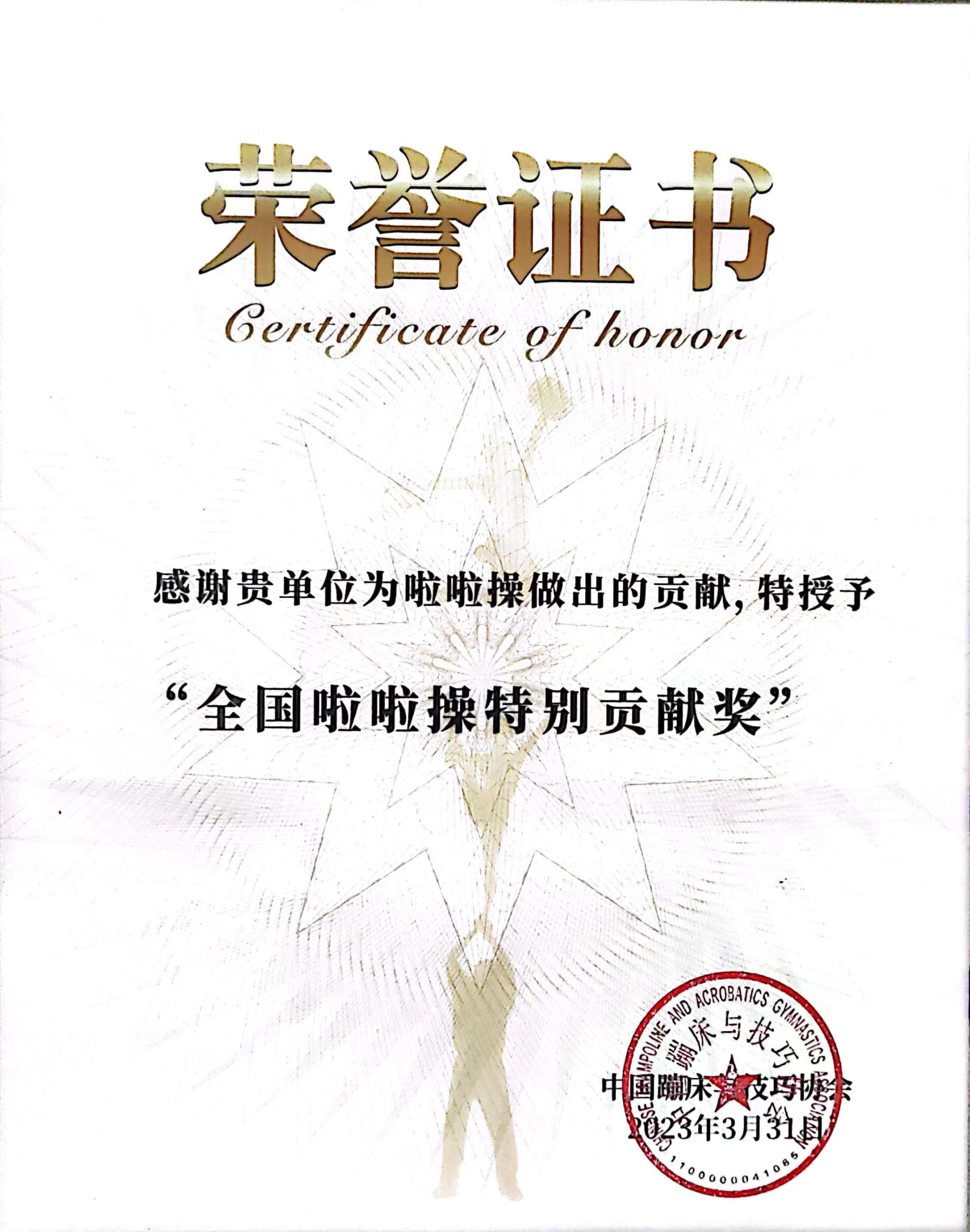 自2016年以来,我校积极组织参与全国啦啦操各级比赛,取得了一系列可喜成绩,获得全国联赛第一名12项、第二名5项,全国锦标赛冠军2次、亚军2次,全国冠军赛亚军1次,南京国际公开赛亚军1次、亚太公开赛冠军1次,充分展现了财大学子的竞技水平和青春活力,为全国啦啦操运动的深入开展做出了重要贡献。同时,学校积极开展校园啦啦操竞赛和活动,使啦啦操成为我校特色项目,此次“全国啦啦操特别贡献奖”的获得,是对学校多年来辛勤付出和优异成绩的充分肯定。我院将一如既往地坚持以师生为中心的发展思想,加强竞技体育,带动群众体育,不断提高全校学生的身体素质,努力为学校高质量发展做出新的更大的贡献。