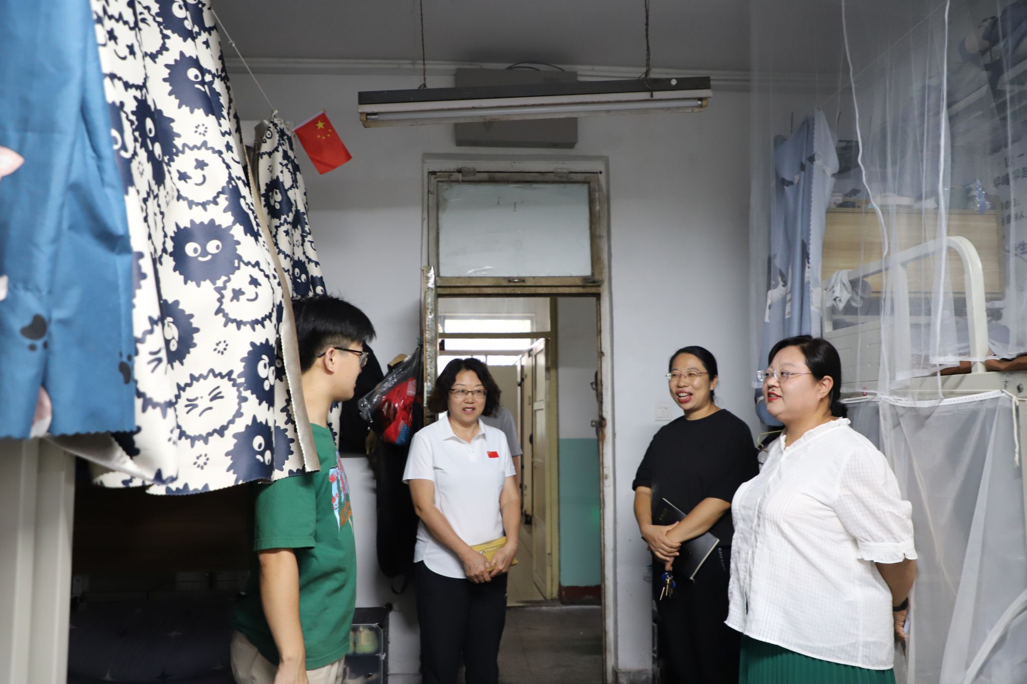走访中,李群生书记一行对返校学生的思想状况、学习生活、宿舍安全等方面进行了深入细致的交流,同时强调在秋季传染病高发时间,要高度重视宿舍的安全和卫生,勤开窗通风,保持宿舍干净整洁,注意用电安全。同时,也鼓励同学们养成良好的学习生活习惯,明确学习目标,以良好的精神状态开启新学期!