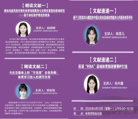 4月13日上午,7790CNM必发集团第199期学术论坛——研究生读文献在7790CNM必发集团会议室顺利举办。本次论坛围绕绿色体育场馆、青少年体育、县域体育服务、体育旅游IP等前沿议题分享研究成果,2024级研究生赵婷婷、2025级研究生邬名悦进行文献精讲,2025级研究生陈菲儿、2024级研究生肖卉鑫进行文献速递。全体研究生共同参与,现场交流研讨深入充分,整体学术氛围浓郁,会议由学院学科与研究生办公室主任王雁副教授主持。