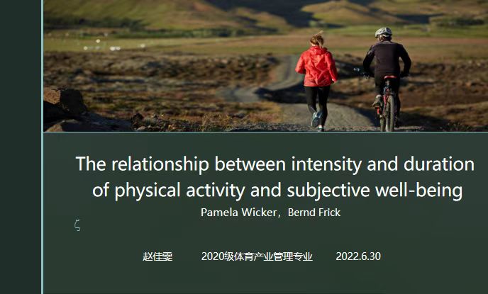 赵佳雯的主题为“体育活动的强度和持续时间与主观幸福感之间的关系”,主讲文章为来自德国科隆体育大学体育经济和体育管理系PAMELA WICKER学者的《THE RELATIONSHIP BETWEEN INTENSITY AND DURATION OF PHYSICAL ACTIVITY AND SUBJECTIVE WELL-BEING》,来自《THE EUROPEAN JOURNAL OF PUBLIC HEALTH》期刊,文章收集了来自28个欧洲国家的代表性调查数据,运用回归分析探讨了体育运动的参与强度和持续时间对主观幸福感的影响。