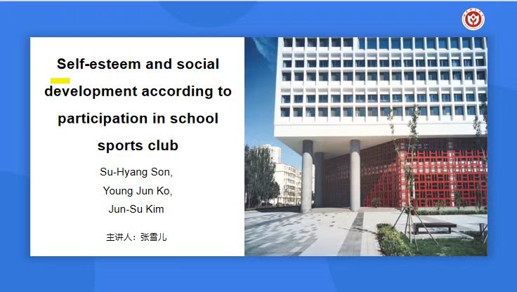 张雪儿的主题为“参加学校体育俱乐部的自尊与社会发展”,主讲文章为来自韩国仁荷大学的孙秀香学者的《SELF-ESTEEM AND SOCIAL DEVELOPMENT ACCORDING TO PARTICIPATION IN SCHOOL SPORTS CLUB》,来自《JOURNAL OF EXERCISE REHABILITATION》期刊,文章旨在探讨中学体育俱乐部的意义,并了解参加中学体育俱乐部对中学生自尊和社会发展的影响。